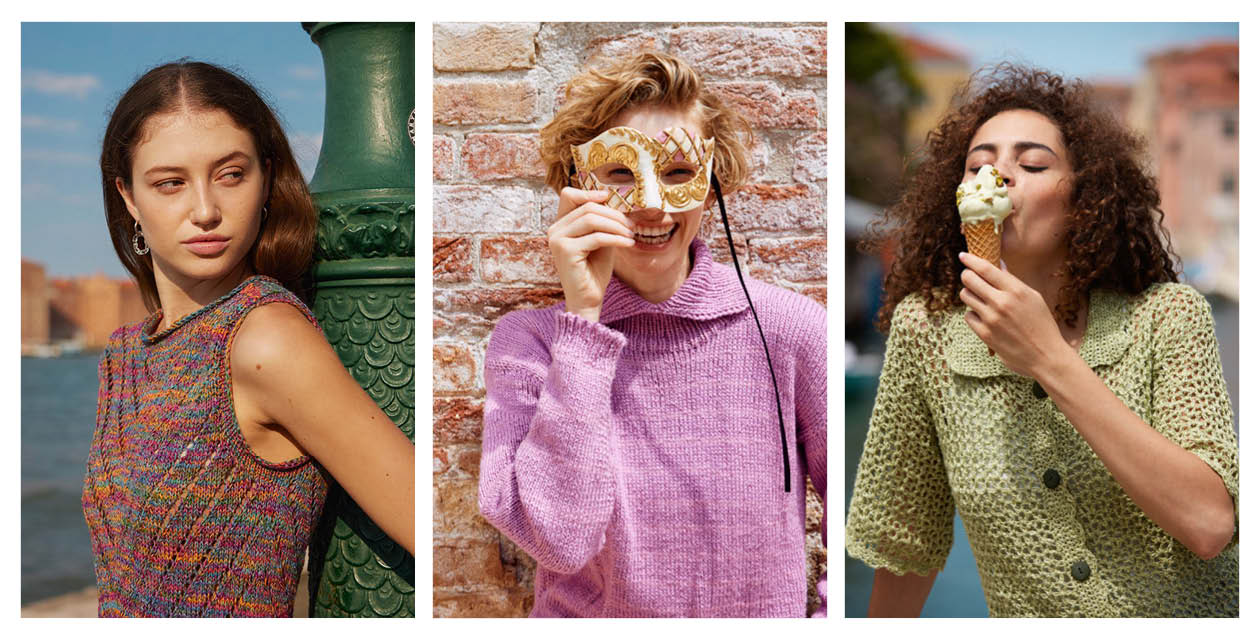 Auch WOOLADDICTS #16 lädt zu sommerlichen Projekten ein und präsentiert leichte Designs vor der Kulisse Venedigs. Zu sehen sind gestrickte und gehäkelte Modelle von leichten Accessoires bis hin zu sommerlichen Pullovern, gearbeitet aus SWEET, WHISPER, PRIDE, GLOW und FOOTPRINTS.